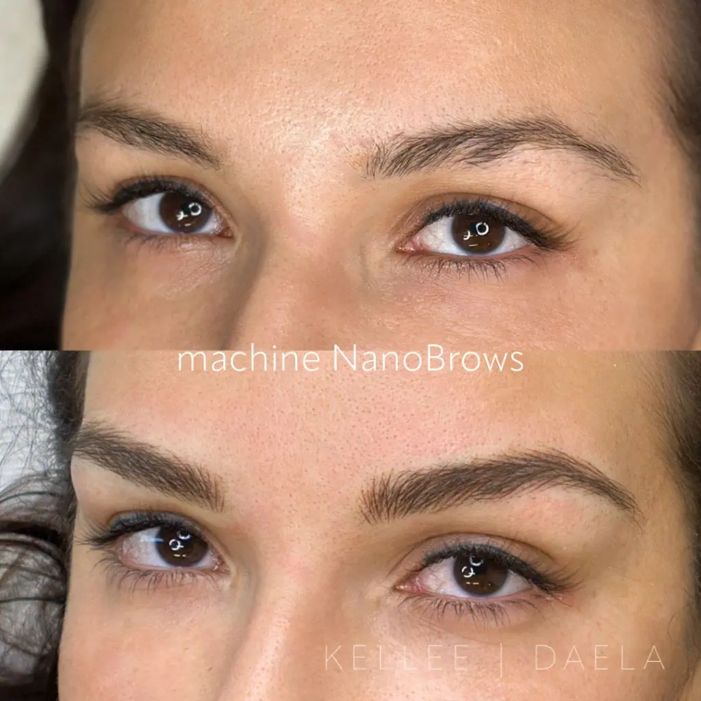 Machine nano brows are created using a cosmetic tattoo machine with a single nano needle. This needle gently implants pigment into the upper layers of the skin in fine, hair-like strokes that mimic your natural brow pattern. The result? Fuller, softer, and more natural-looking brows that age beautifully.