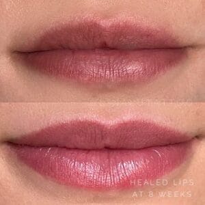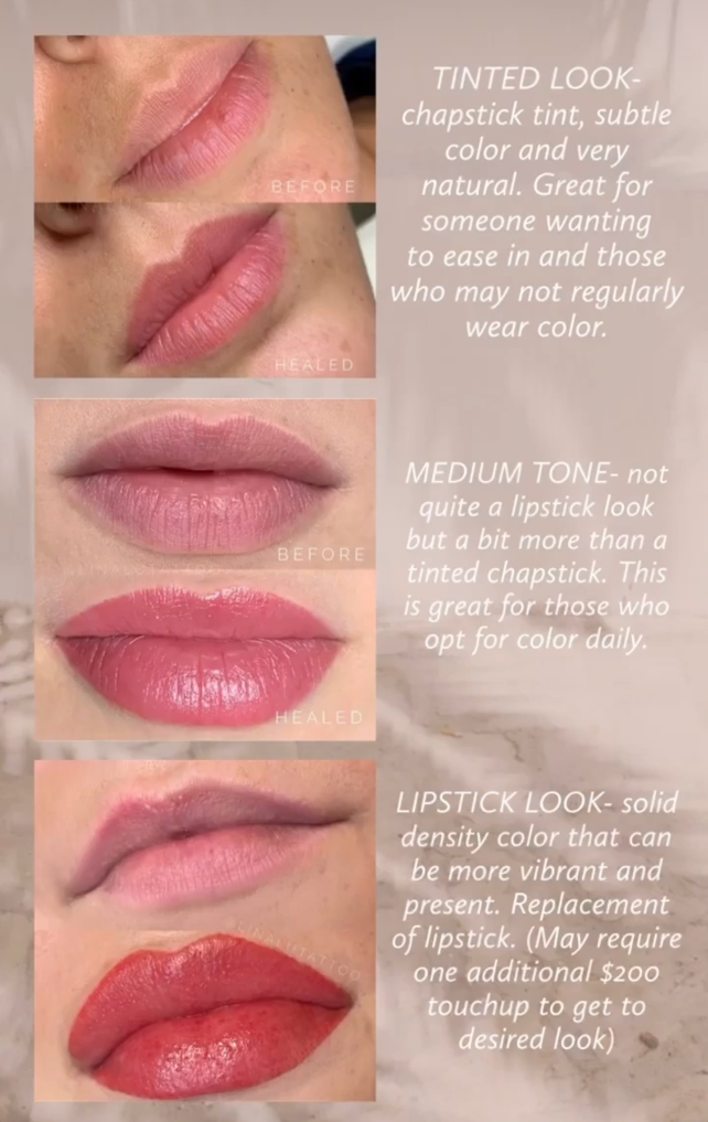 No matter which density you desire, lip blush is so versatile: This fabulous blush will last 2-3 years (longer for some). You can wear lipstick over the top of lip blush tattoo, any time you like. You can skip lipstick any time you like. You can also refresh lip blush as often as every 6 months, if you crave a constant deep color.
