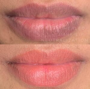 Lip neutralization is a cosmetic tattoo procedure that focuses on color correction and enhancement of the skin. It’s a technique best performed by a skilled cosmetic tattoo artist. Using natural inks, this procedure involves tattooing the desired color onto the deeper layers of the dermal tissue, ensuring long-lasting coverage for approximately 2-5 years.