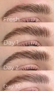 In the first week, your brows will gradually fade as the top layer of skin naturally sheds. The strokes may appear slightly scaly or crusty as healing begins. It’s vital to resist picking or scratching to avoid interfering with the final outcome.