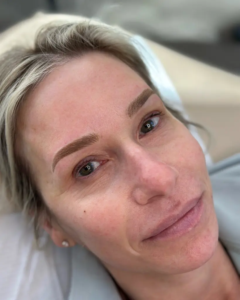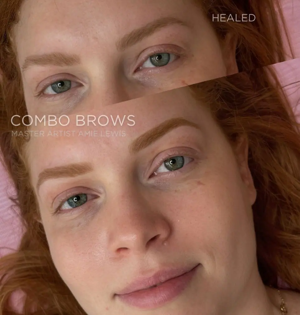 Expect light flaking around days 4–7, followed by softening of color. Brows may look darker right after treatment but fade into a more natural tone as they heal. A touch-up is needed at 6–12 weeks.