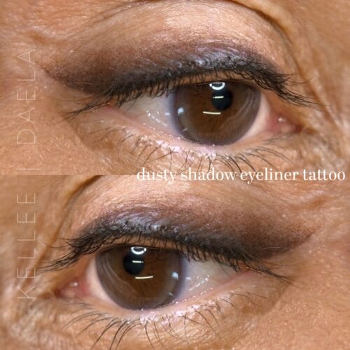 - Dusty shadow eyeliner tattooing allows for customization in terms of color intensity and shape, providing clients with the option to achieve a subtle enhancement or a more dramatic look, depending on their preferences.