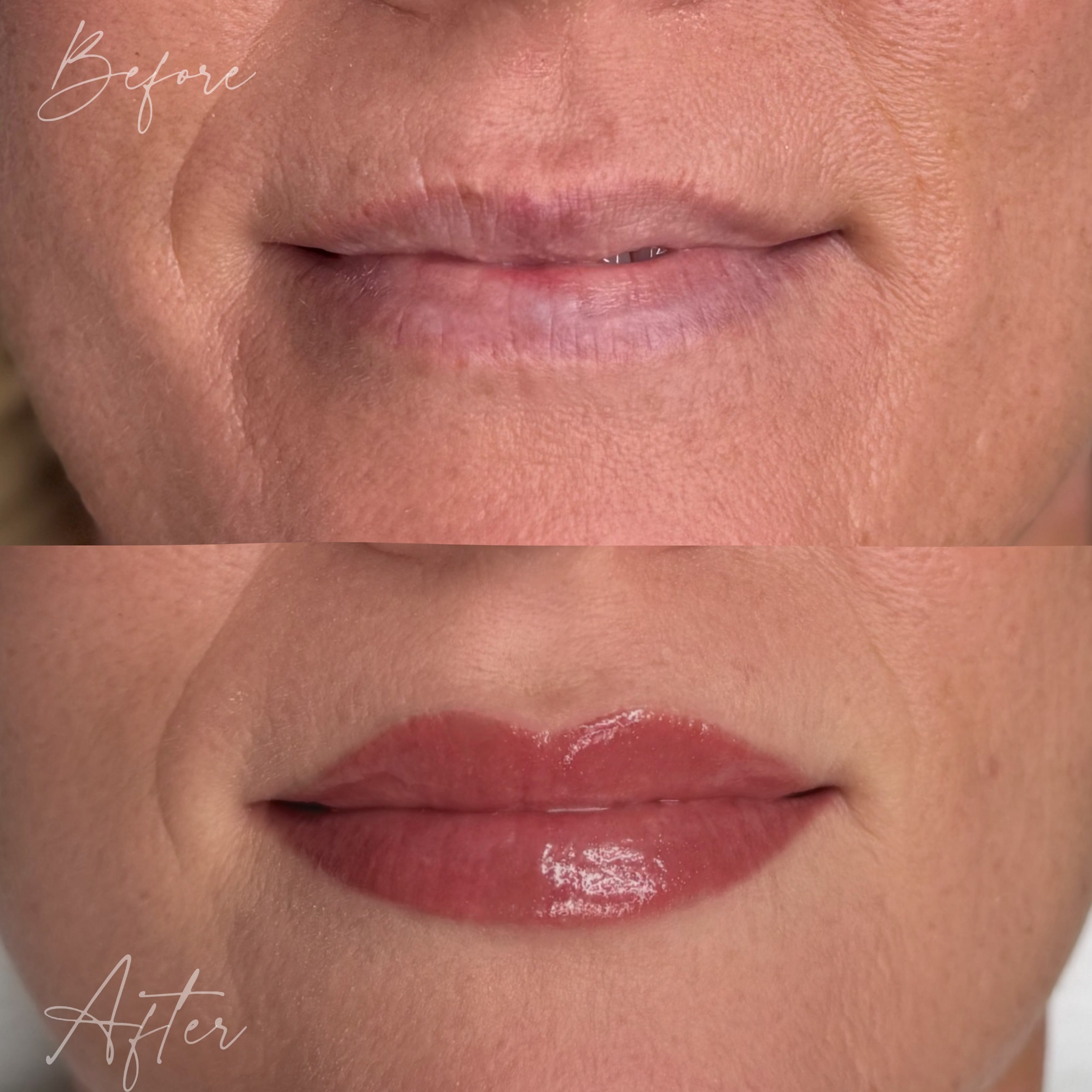 There is no physical downtime. You will experience 1-2 days of a bold and bright lip, followed by 2 days of chapped lips. Outward healing is done after this stage, but lips continue to change and adjust in color for the next month. At one month, all color is balanced, and the lips are fully healed. You can view the complete before and after care instructions on this website!