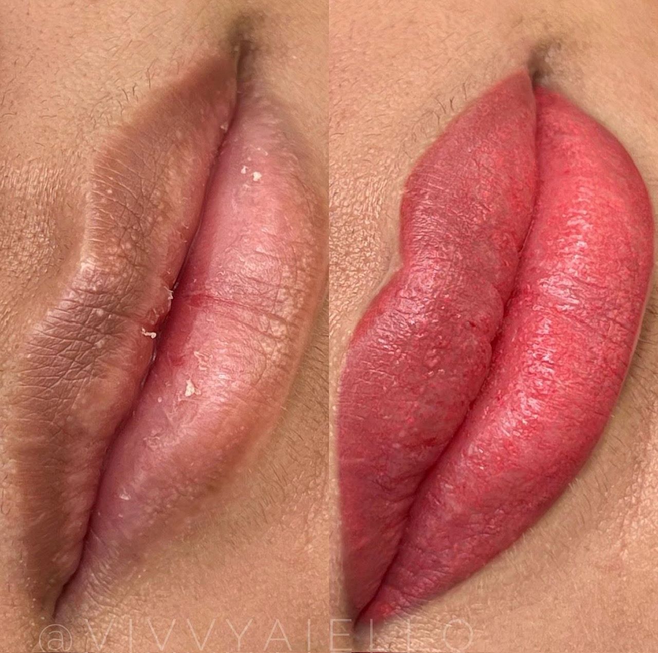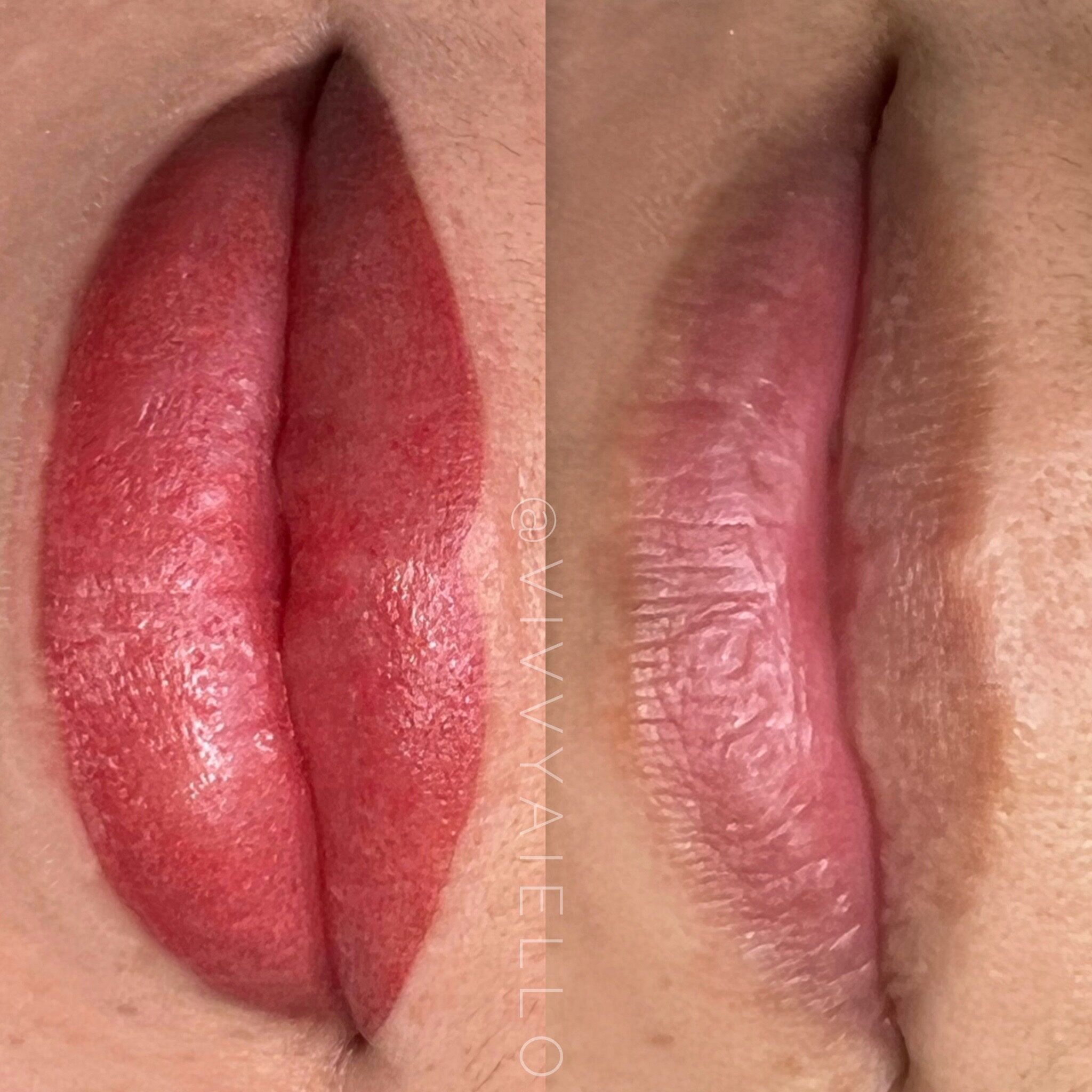 Initial healing takes about 5-10 days, during which the color may appear darker before softening. Some swelling and flaking are normal, and full healing can take up to 4-6 weeks.Can I still wear lipstick or lip gloss after the procedure?