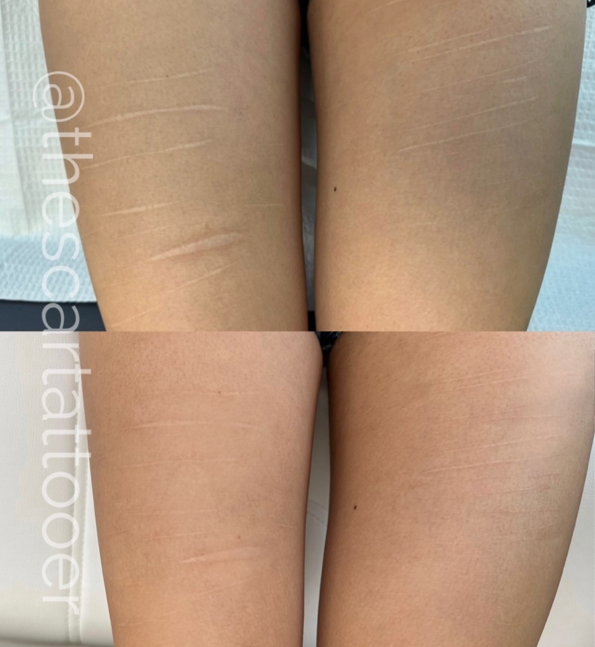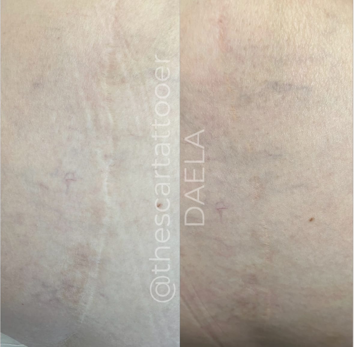 - They are highly effective in minimizing the appearance of scars and stretch marks by utilizing a pigment-free vitamin serum, which is micro-needled into the skin using a tattoo machine.